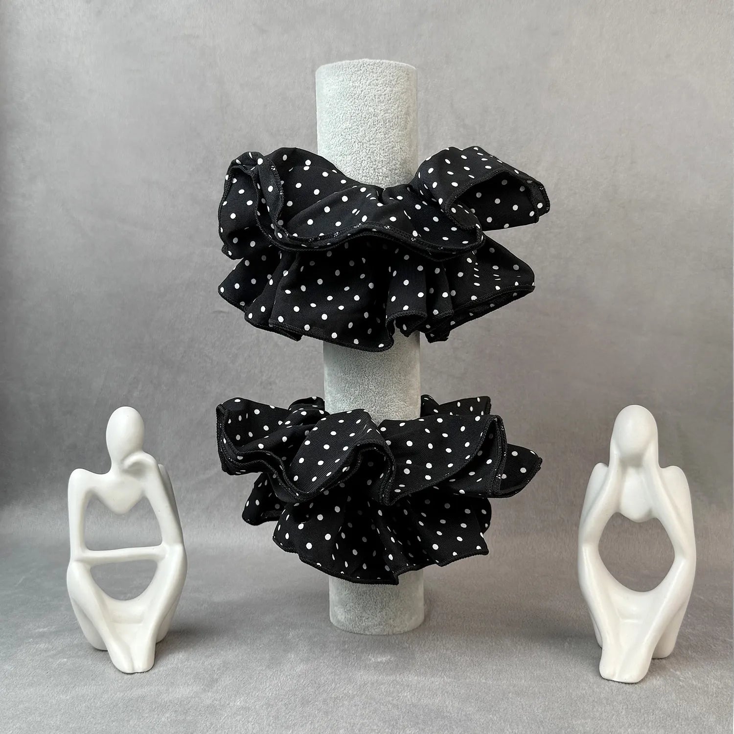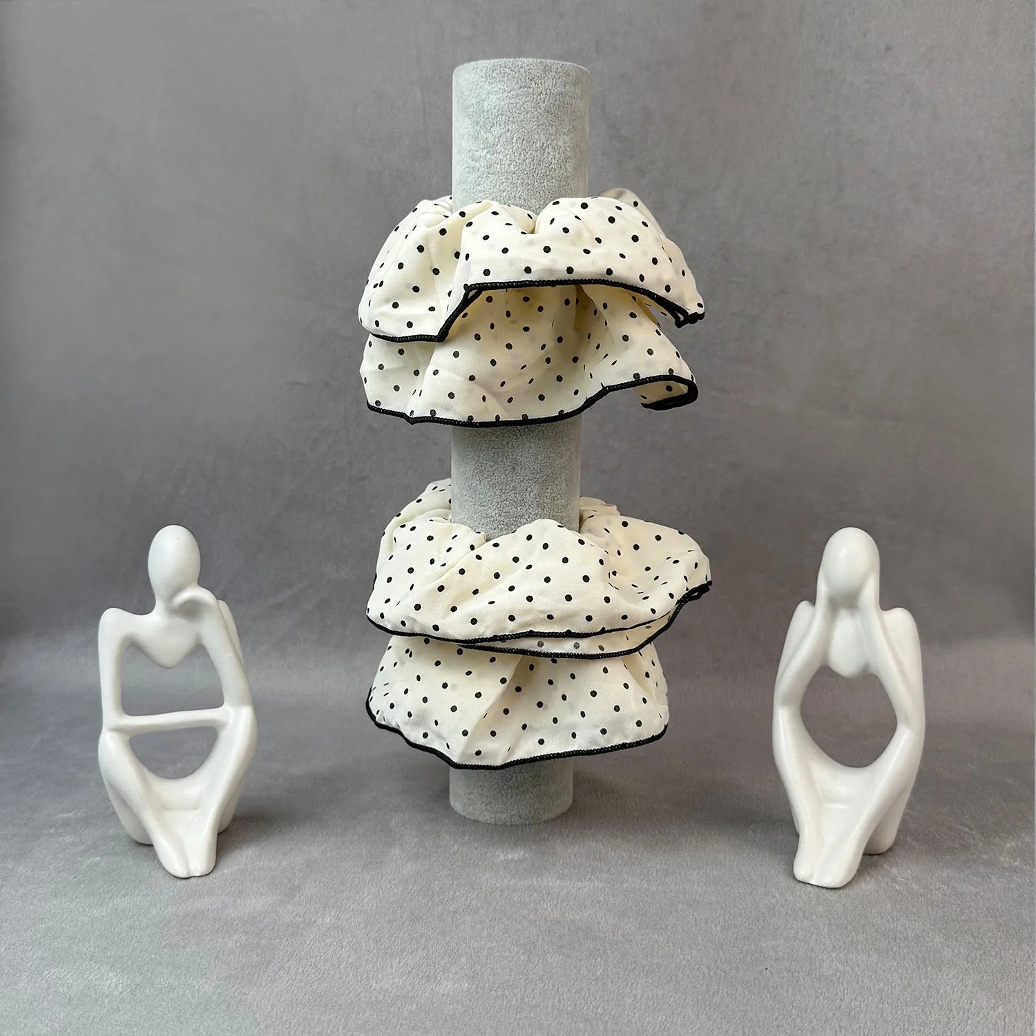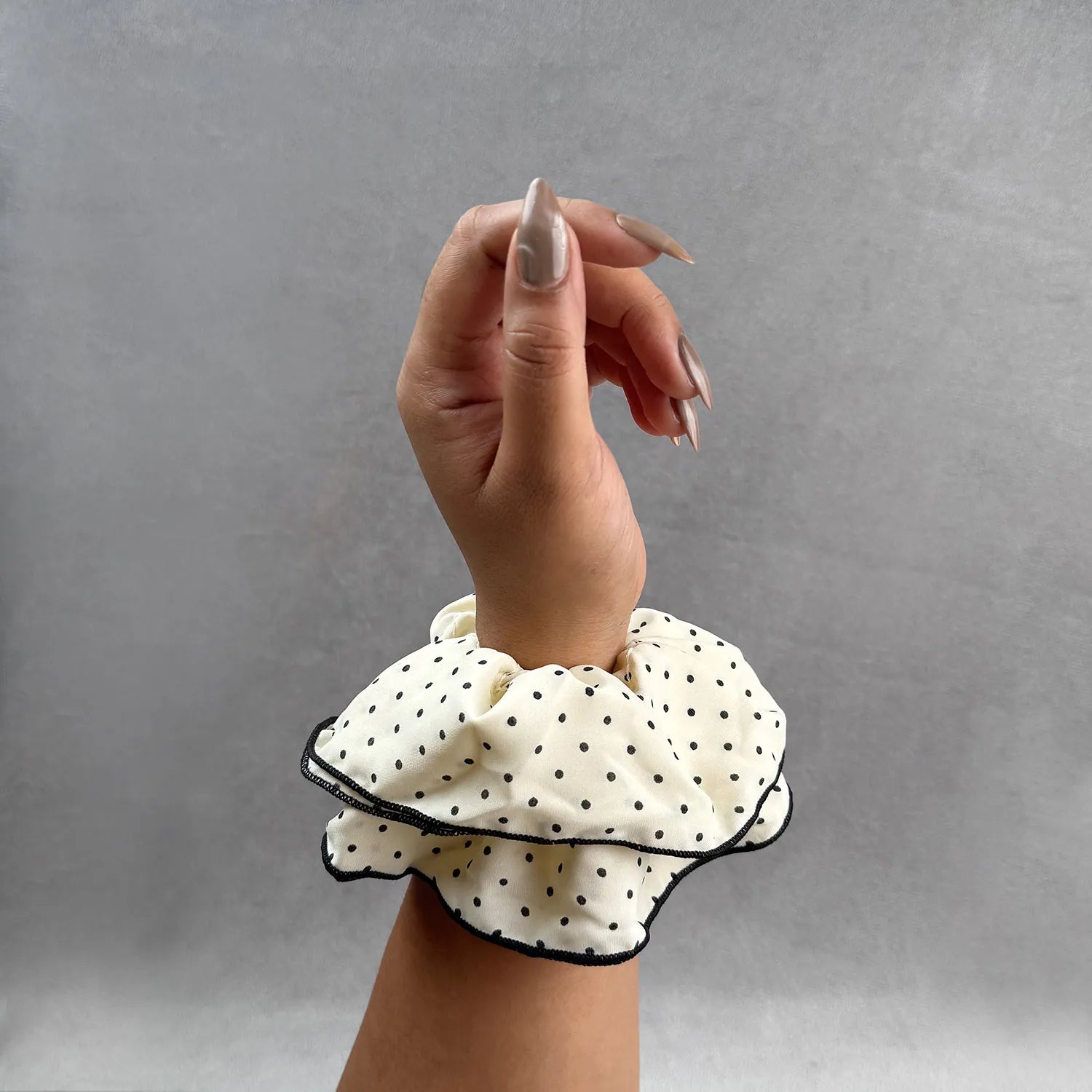 The defining feature is its playful double polka dot layering, where overlapping ruffles create dimension and movement. This unique motif blends a timeless print with a lively twist, turning an everyday hair tie into a statement accessory.