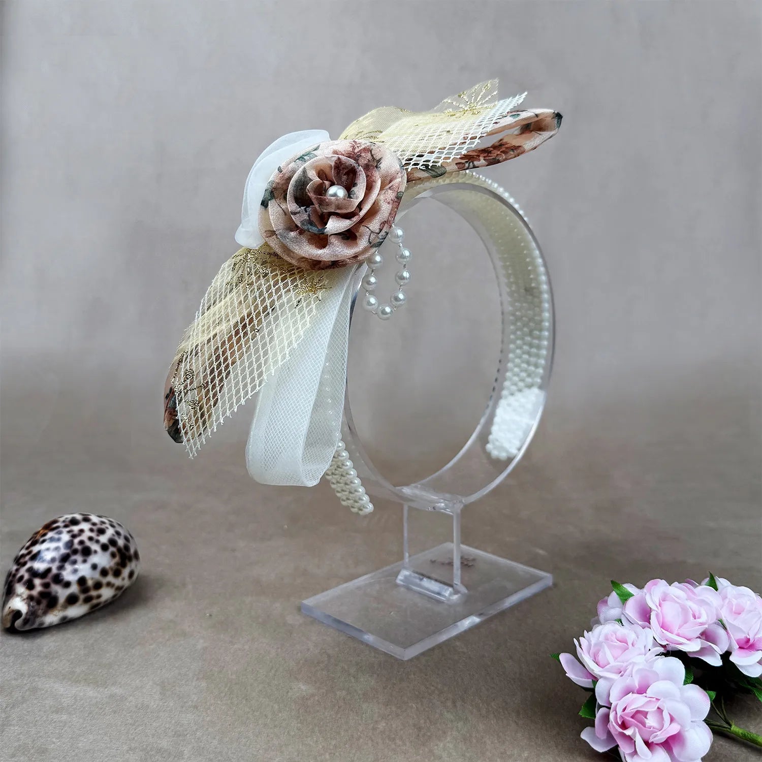 Elevate special looks with this dual-tone handmade fascinator hairband, crafted with roses, pearls, and net for a graceful festive charm.