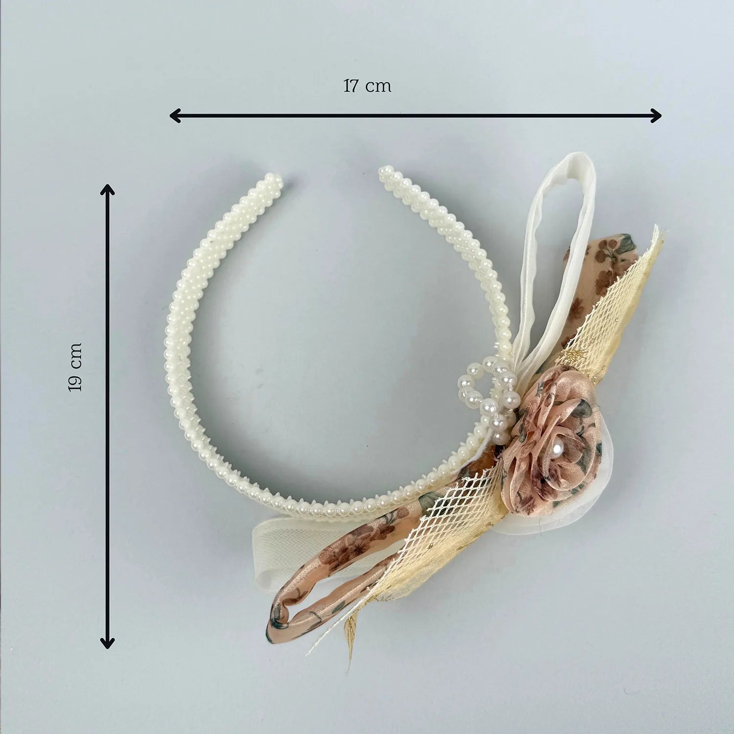 This premium beauty hairband is carefully handmade on a pearl base, blending artistry with durability. Dual-toned layers of organza roses, textured net, and pearl accents bring a refined handcrafted appeal.