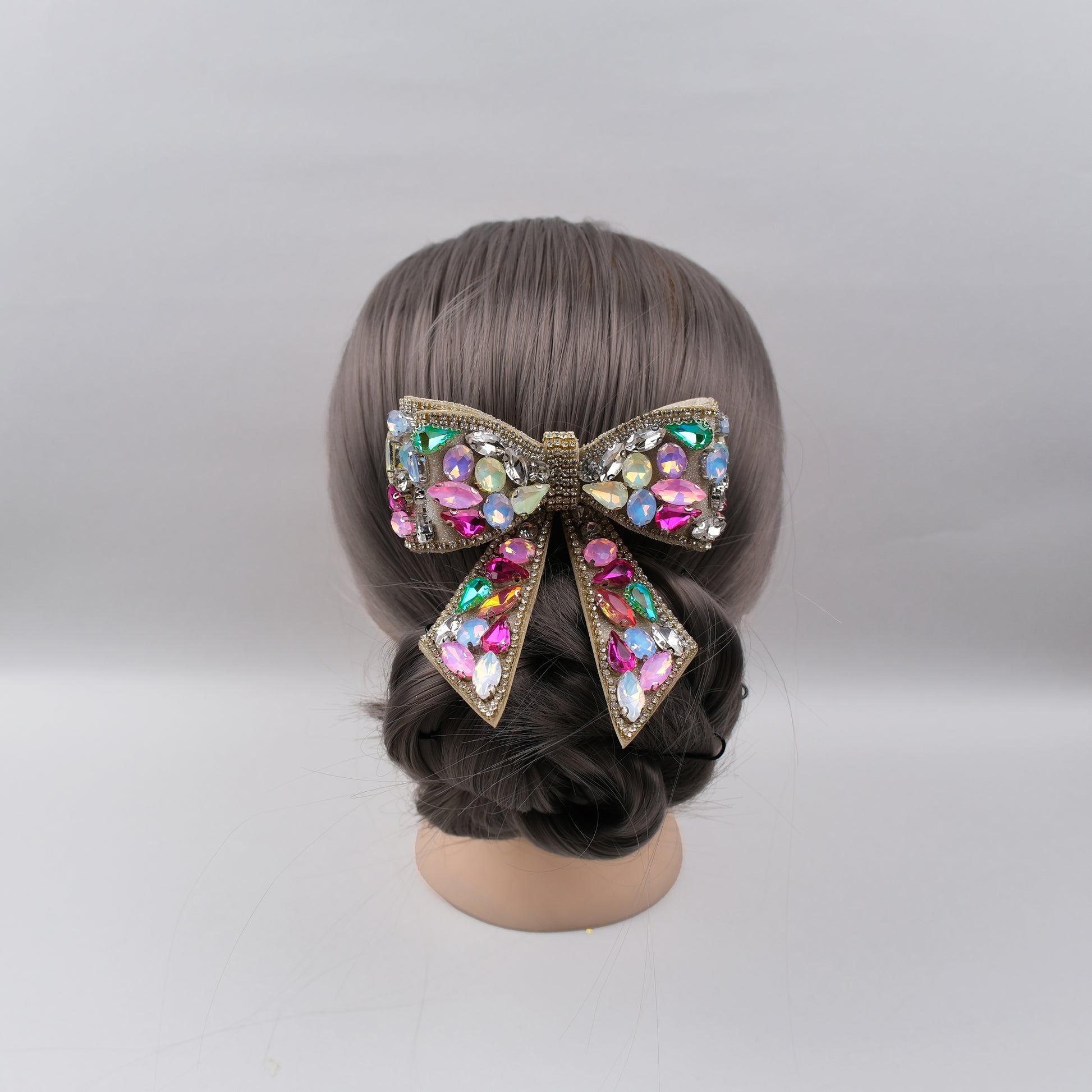 The bow features an eye-catching spread of multi-coloured stones and rhinestones arranged across its layered silhouette. Each stone reflects light differently, creating a rich, vibrant shimmer. The elongated tails further highlight the colourful pattern, giving the clip a statement-worthy presence from every angle.