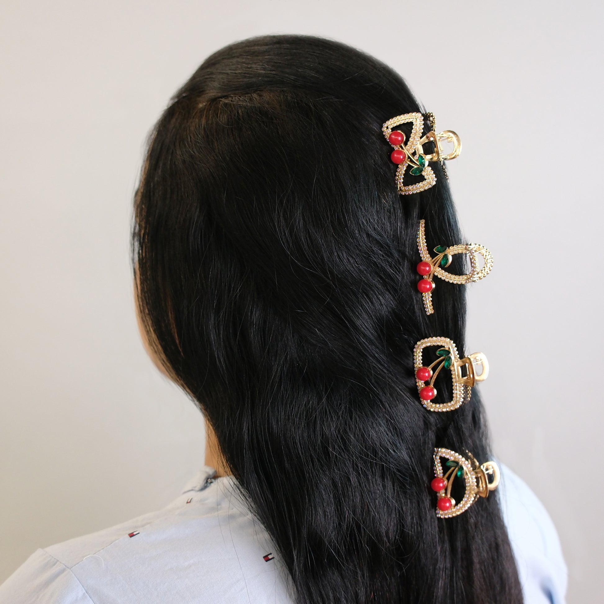 The highlight of this clip is its cherry stone centerpiece, framed by shimmering crystal accents. Together, the motif reflects a playful yet refined aesthetic, balancing vibrant detail with sparkling sophistication for a hair accessory that feels equally joyful and glamorous.