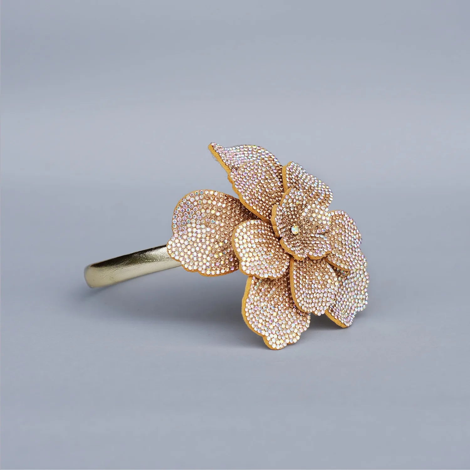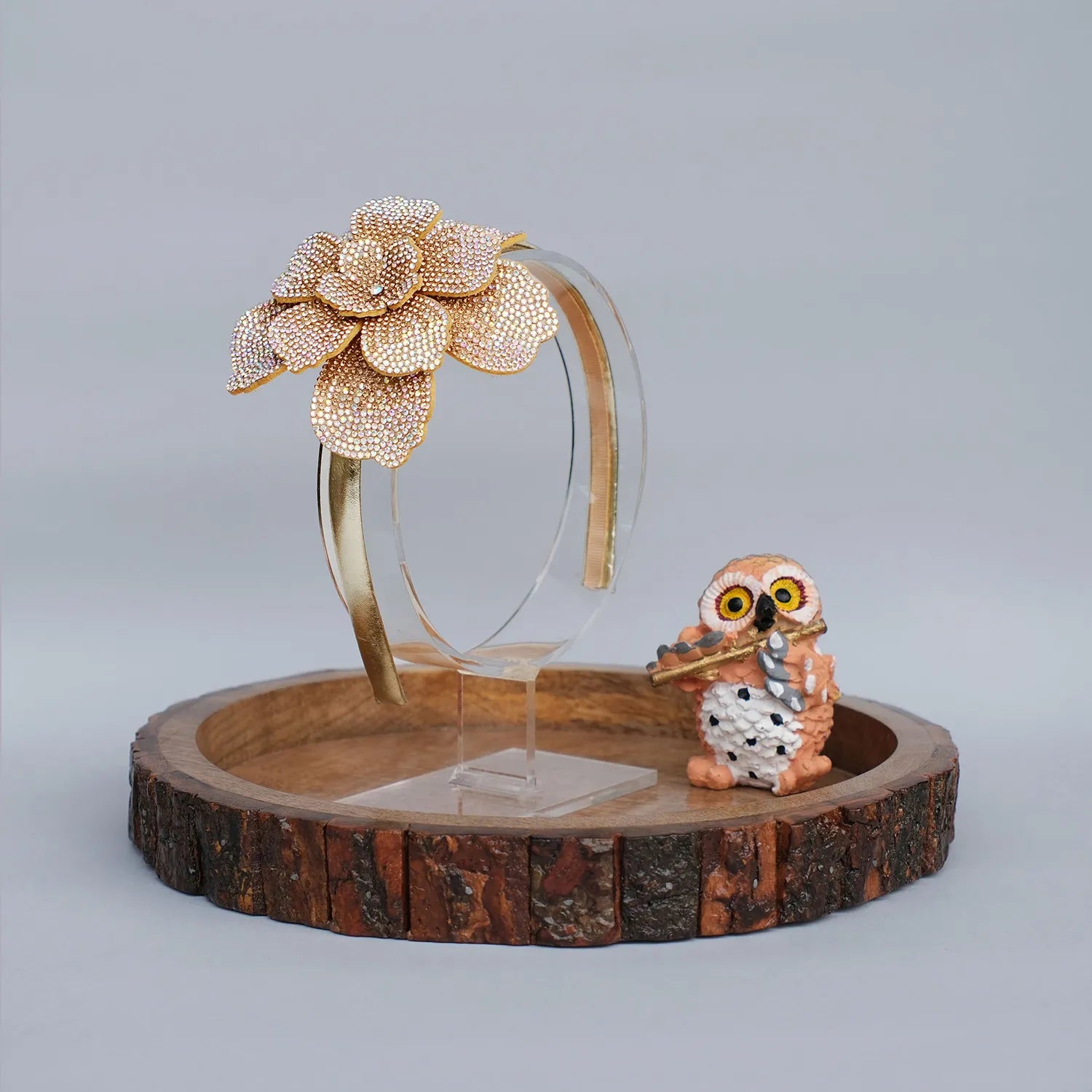 Perfect for weddings, festive evenings, or birthdays, this handmade embellished flower hairband shimmers with golden rhinestones for a graceful statement.