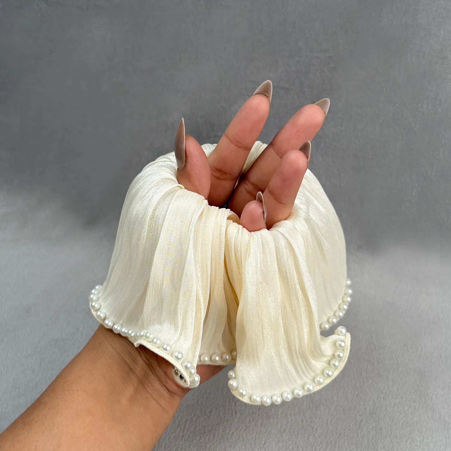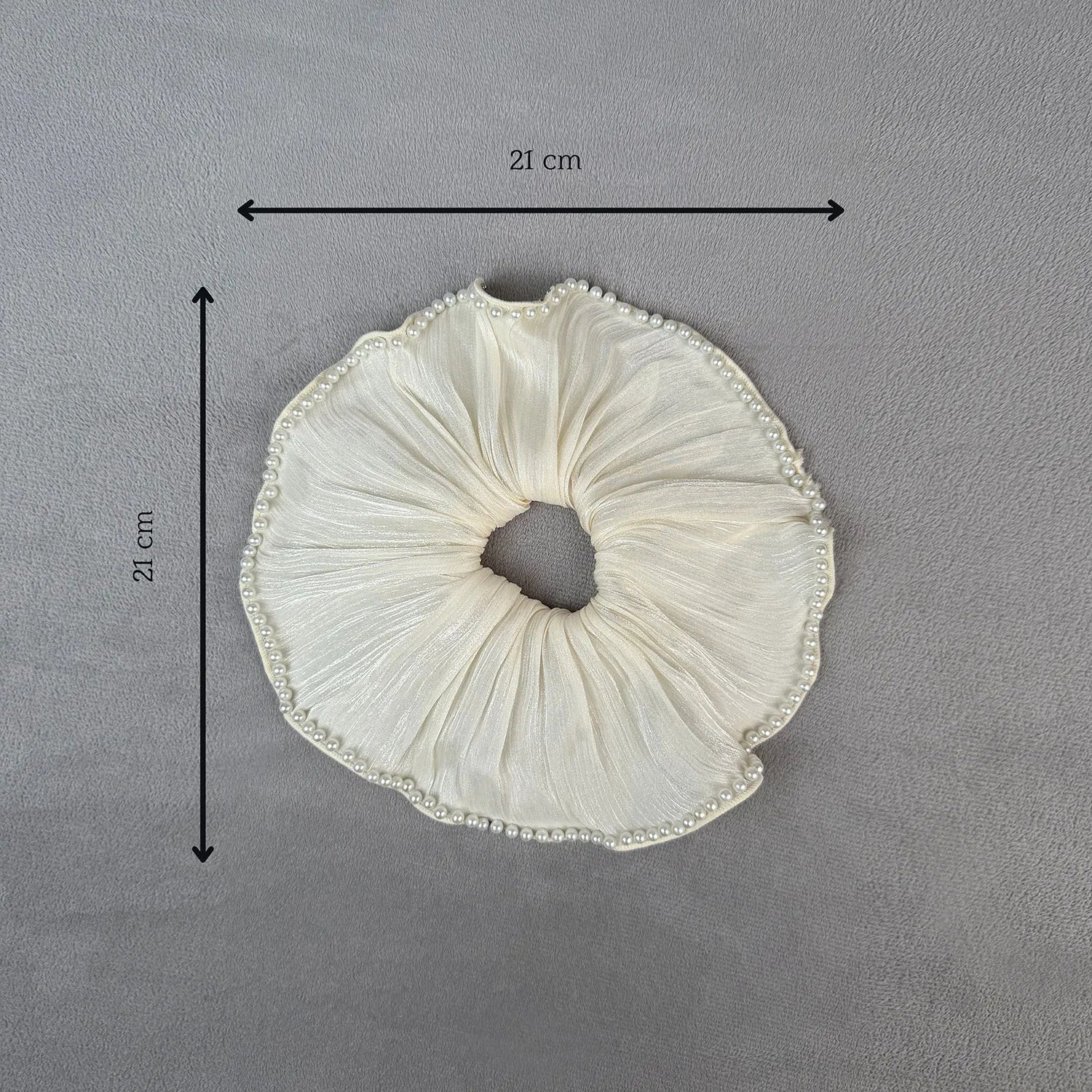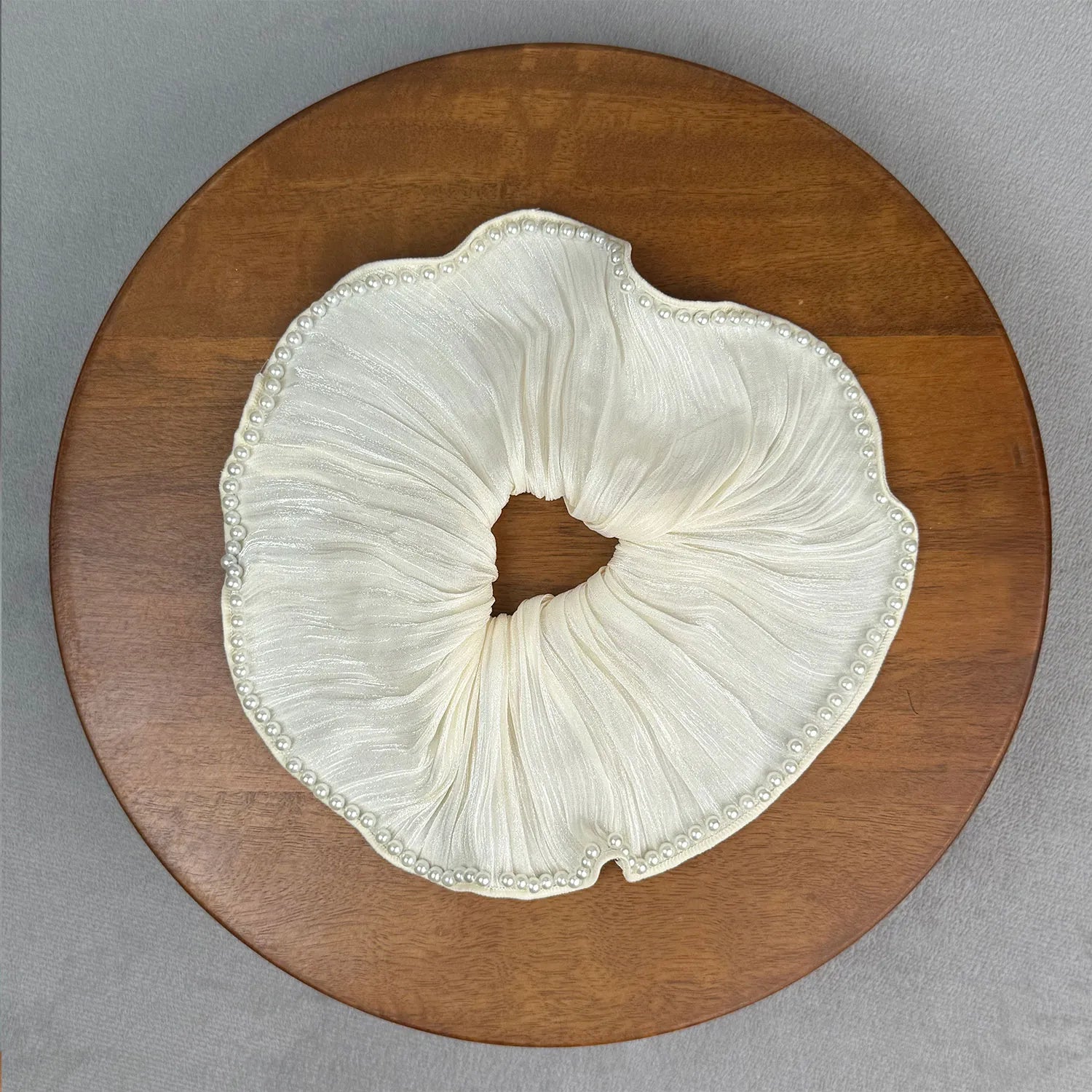 This large scrunchie is crafted from smooth satin silk, shaped into elegant folds that highlight its premium beauty quality. The interlocked pearl edging is meticulously finished, giving every hairstyle a refined look while ensuring it works well with all hair types.