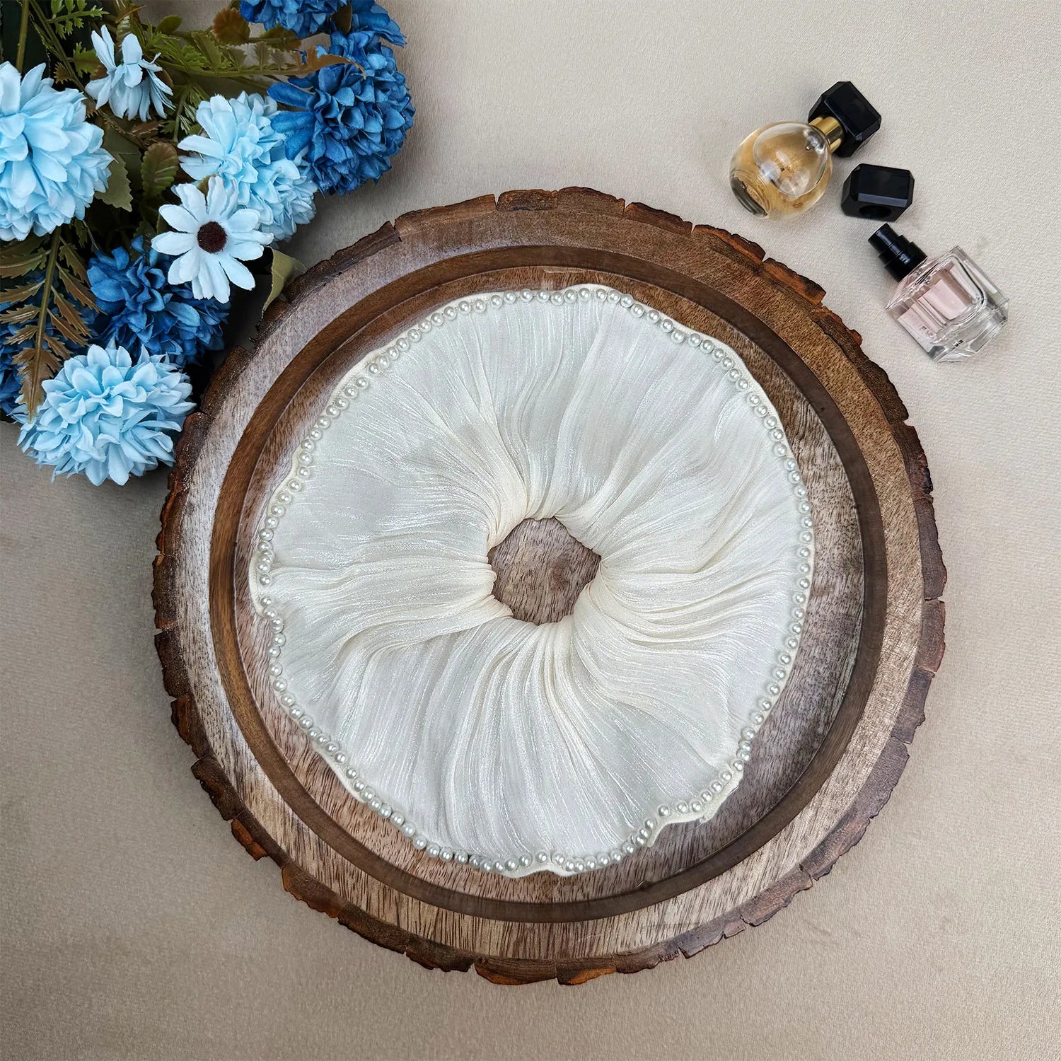 Ideal for weddings, parties, and gifting, this silk satin pearl scrunchie blends festive elegance with comfort for every hairstyle.