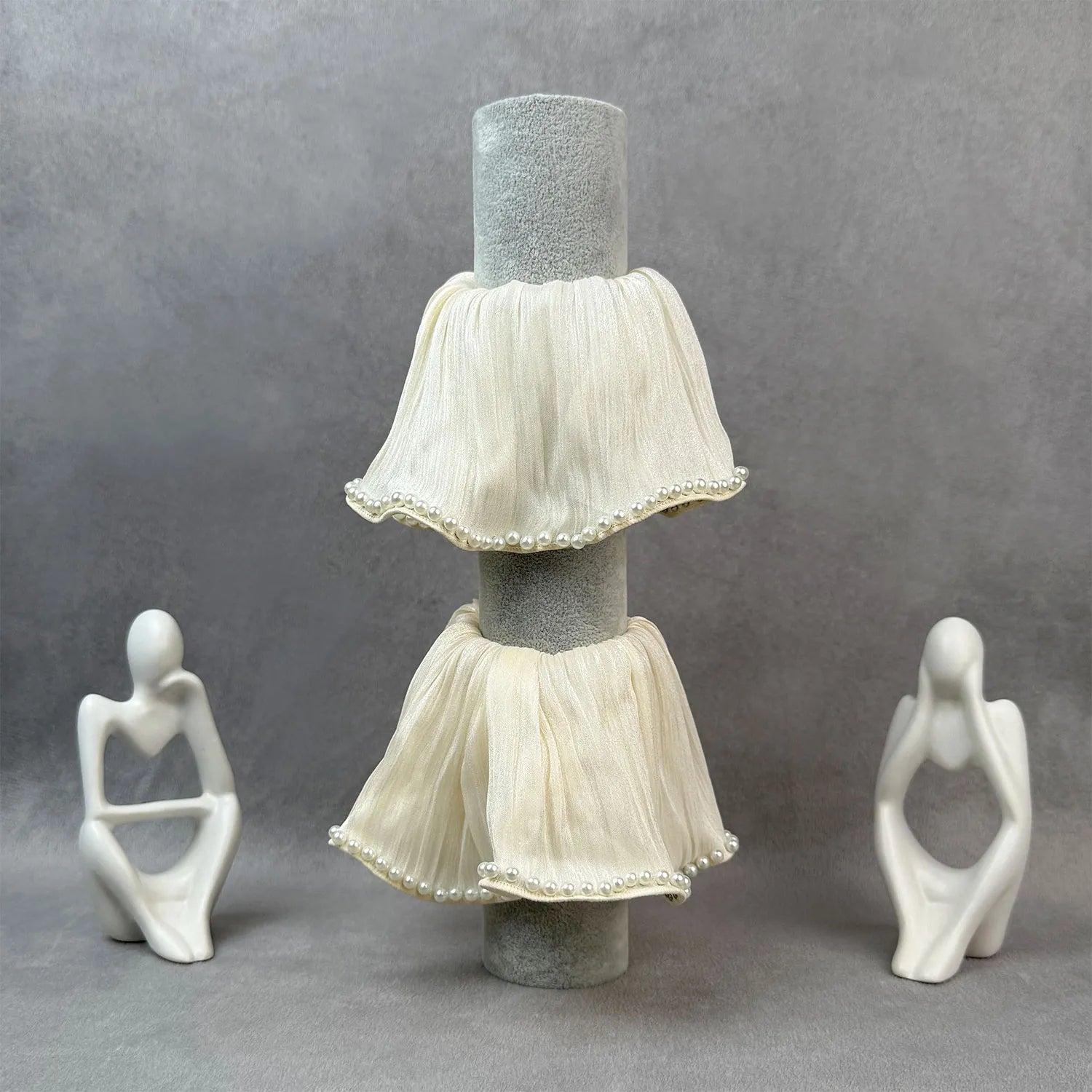 Inspired by timeless elegance, this satin silk scrunchie in soft white combines luxury materials with modern detailing. The cascading pearl accents evoke festive charm and bridal sophistication, making it a versatile styling piece for women and teens who prefer refined hair accessories.