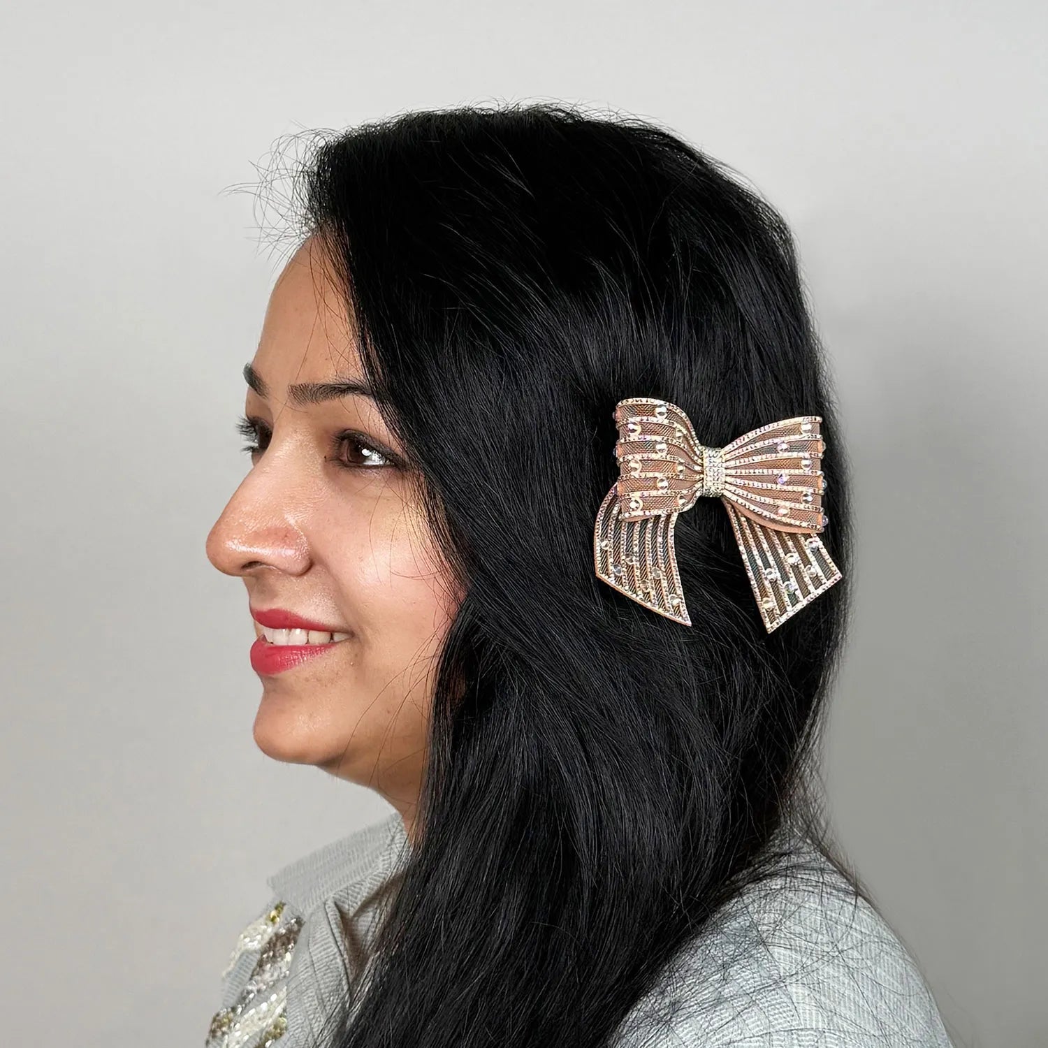 Secured with a sturdy alligator clip base, this bow is easy to wear and keeps hair neatly in place. Whether styling an updo, half-tie, or side sweep, it offers dependable grip and decorative sparkle for party looks or special outings without slipping.