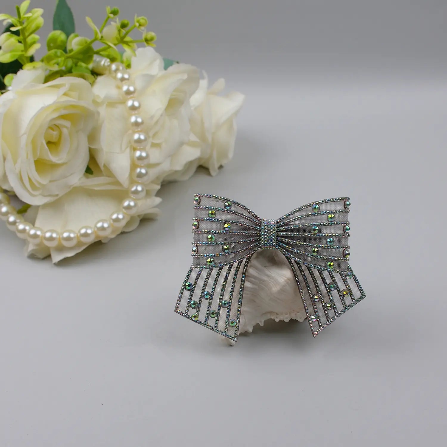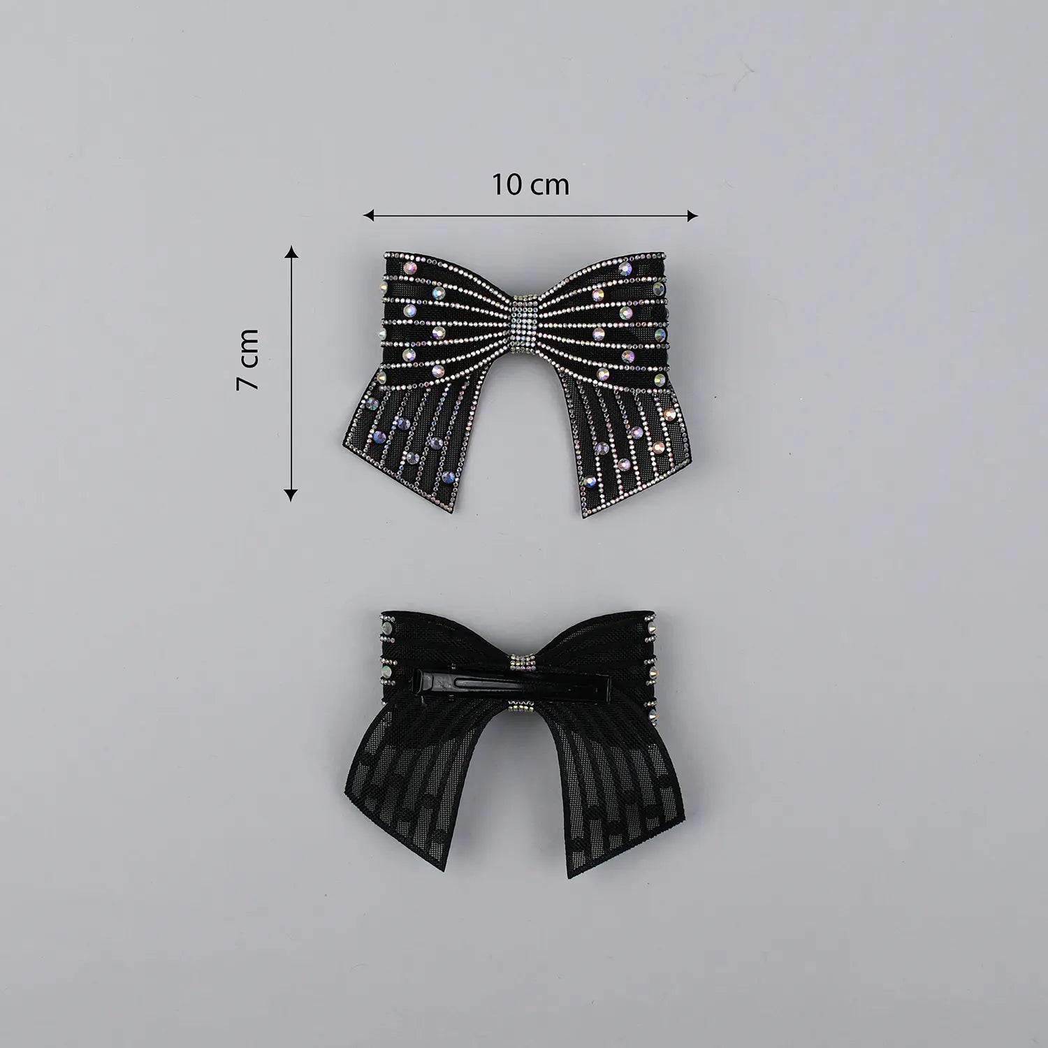Rhinestones are meticulously set across the stiff tissue net to create a luminous surface that catches light with each movement. This signature embellishment transforms the simple bow shape into an eye-catching, party-ready piece while maintaining a refined elegance suited for premium styling.